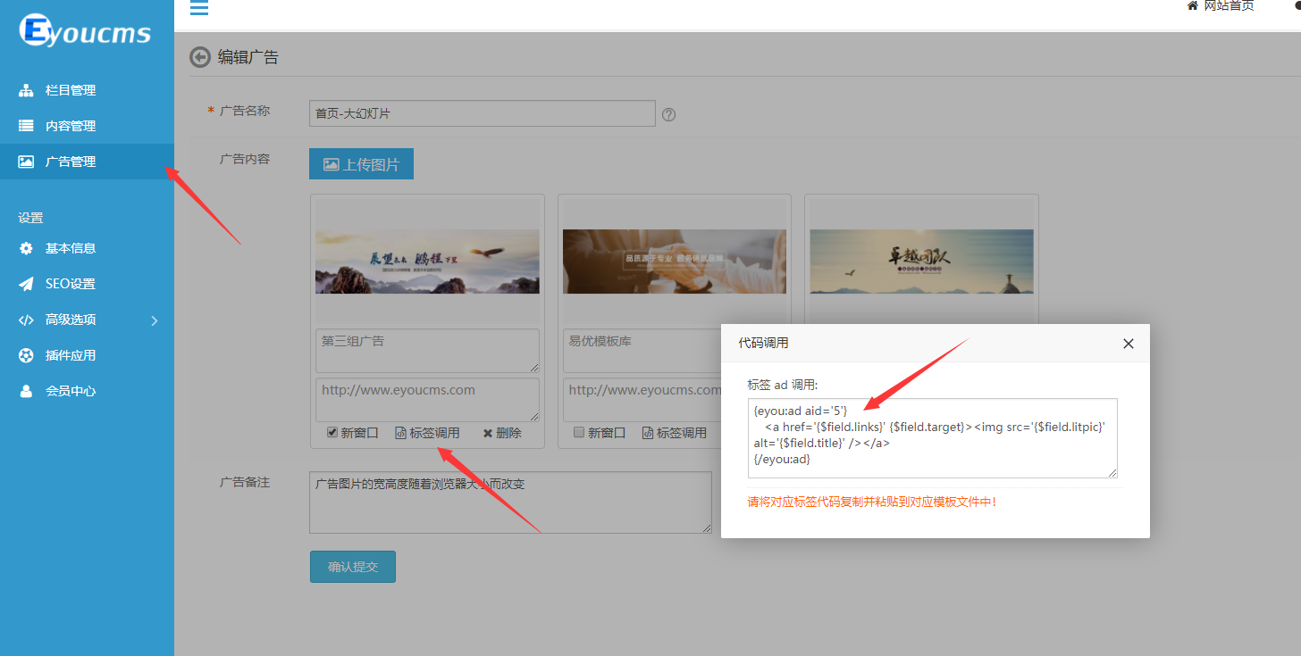 后台广告管理的广告列表里面有单张图片的标签调用,直接复制即可 图例...