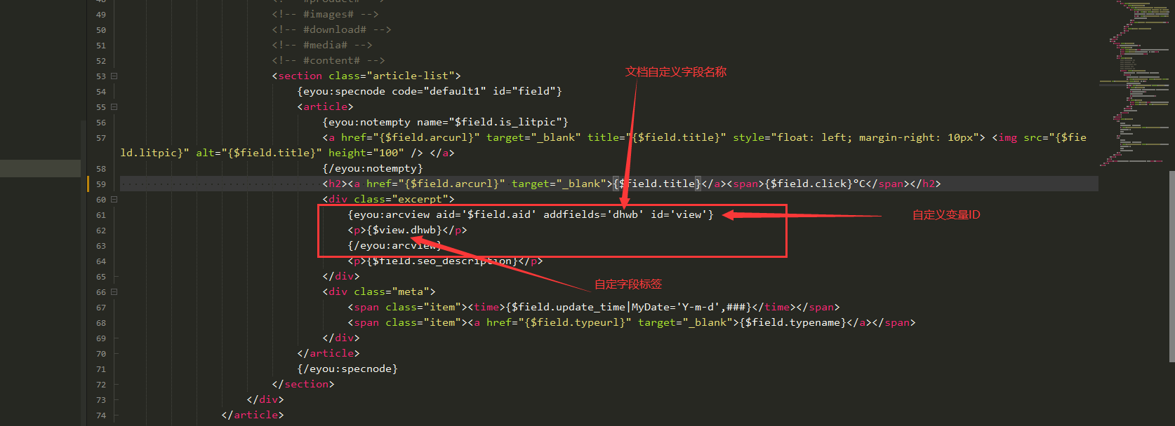 专题详情页的专题节点内的文档需要调用文档自定义字段,改如何调用呢?调用方法:可以配合arcview 单条文档调用标签来使用,话不多说,直接上图调用文档自定义字段需要的标签:{eyou:arcview aid='$field.aid' addfields='改为你的字段名称' id=......