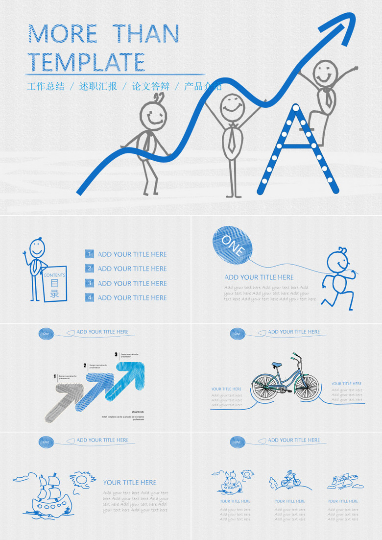 蓝色手绘卡通工作总结述职汇报PPT模板