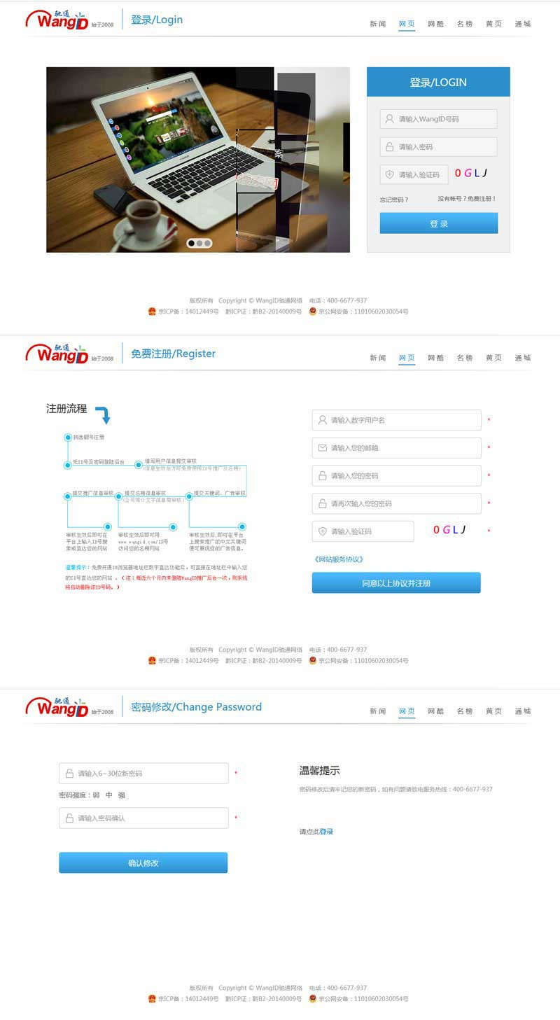 蓝色实用的网站登录/注册/密码找回页面模板