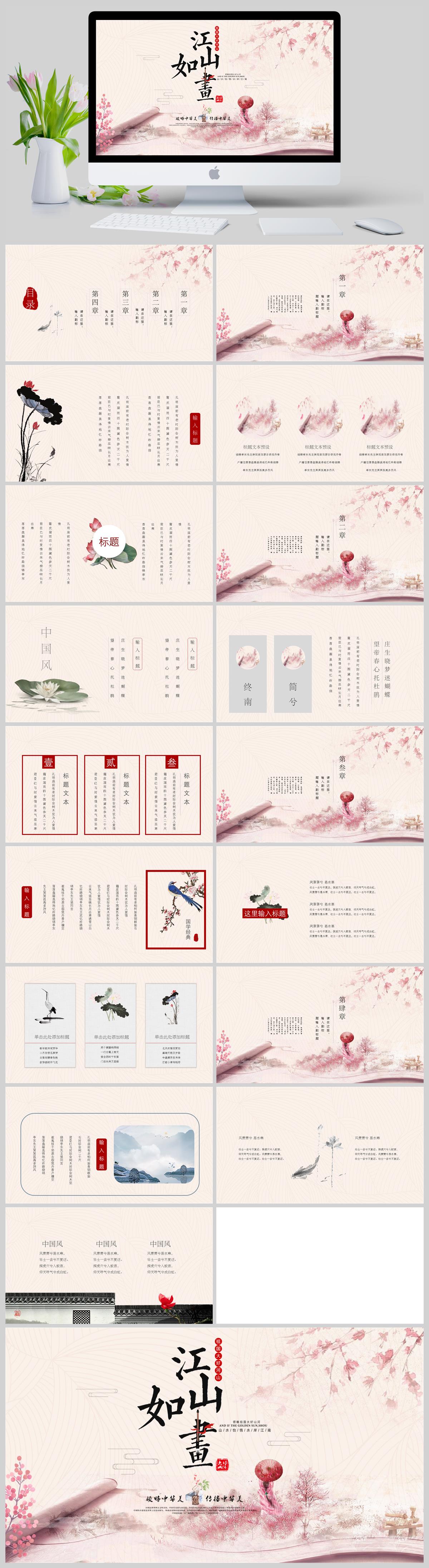 粉色水墨中国风江山如画总结计划国学教育培训通用PPT模板