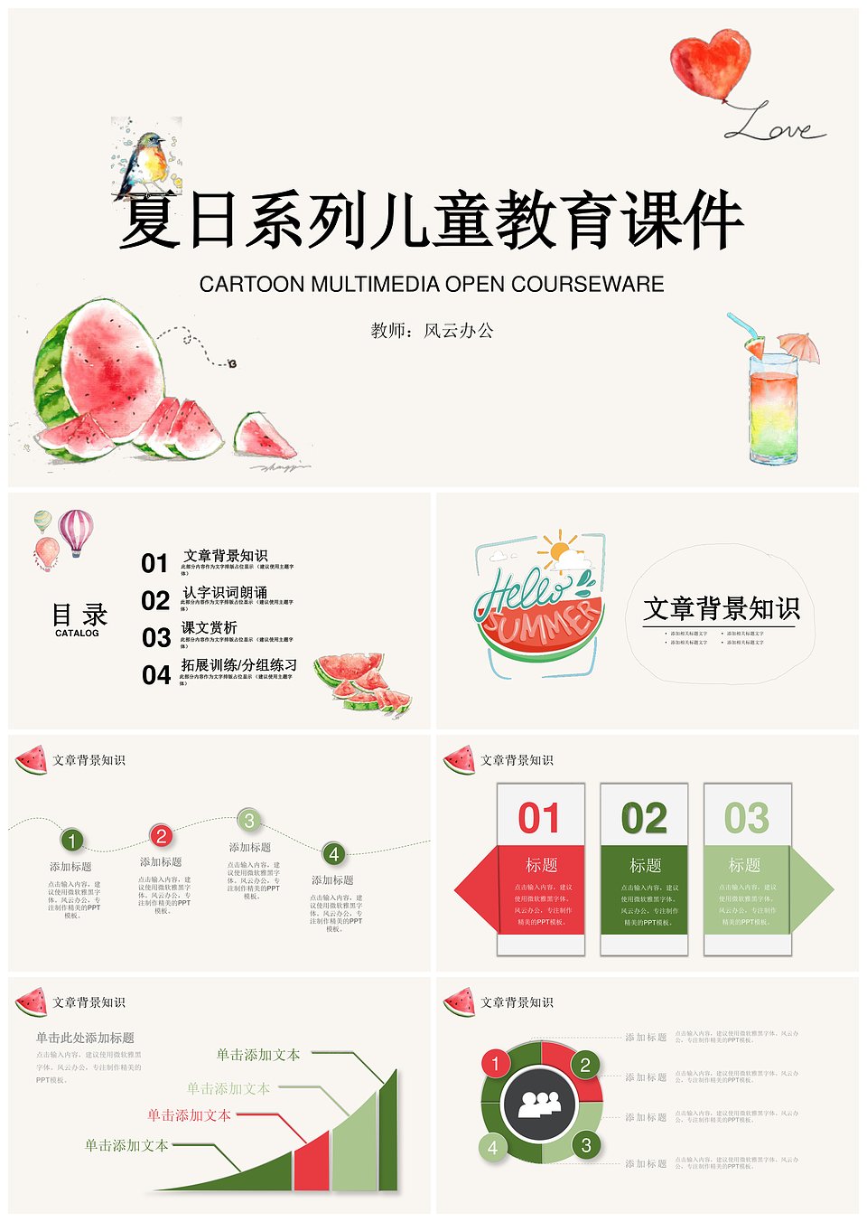 初夏手绘简约小清新水果西瓜通用PPT模板