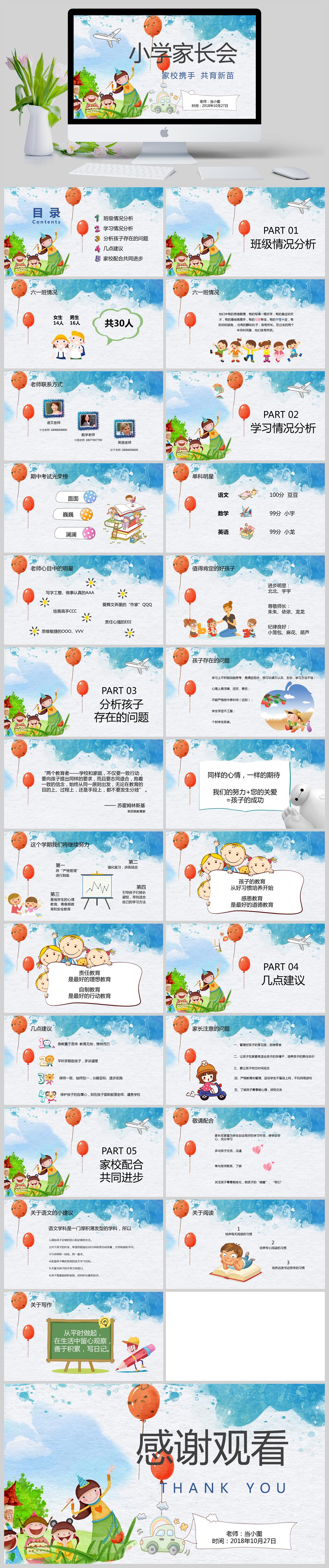 儿童卡通小学家长会家校携手共育新苗PPT模板
