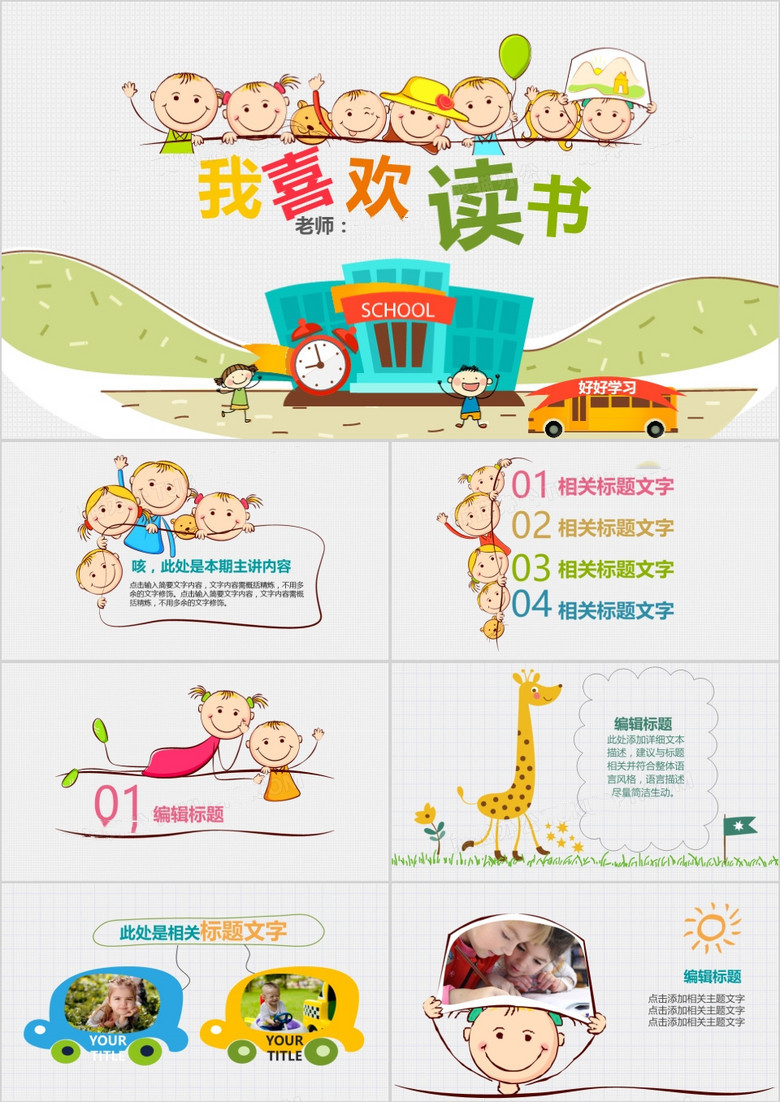 儿童卡通我喜欢读书分享活动主题班会PPT模板