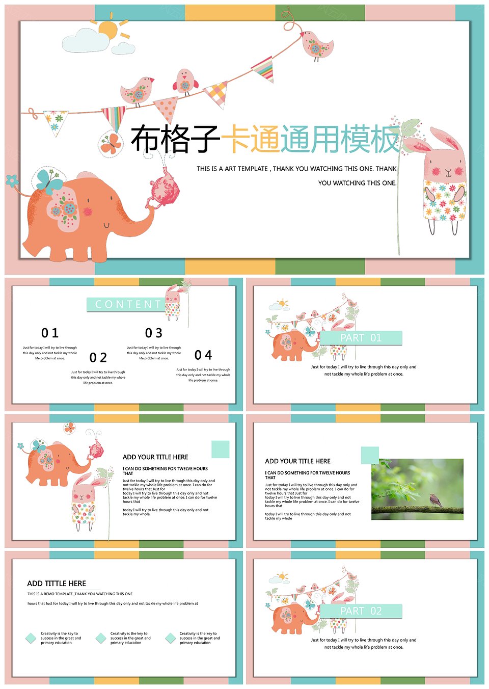 可爱彩色花布格子卡通通用动态PPT模板