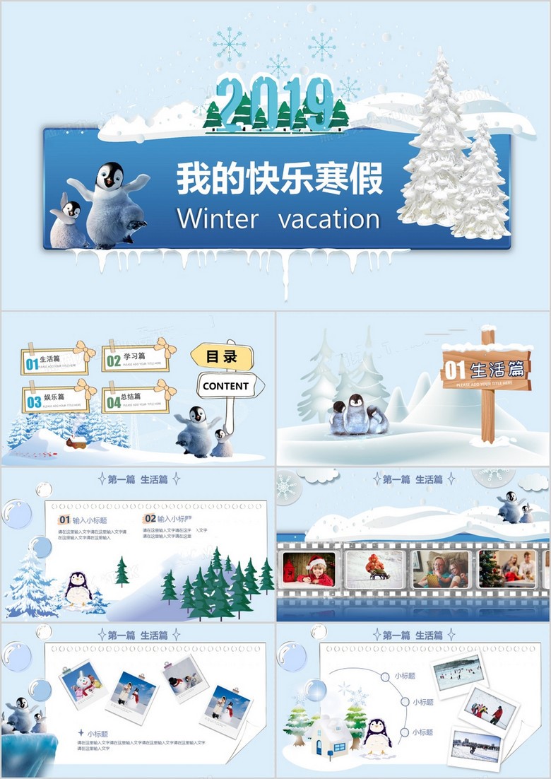 蓝色雪地卡通儿童我的快乐寒假生活电子相册PPT模板