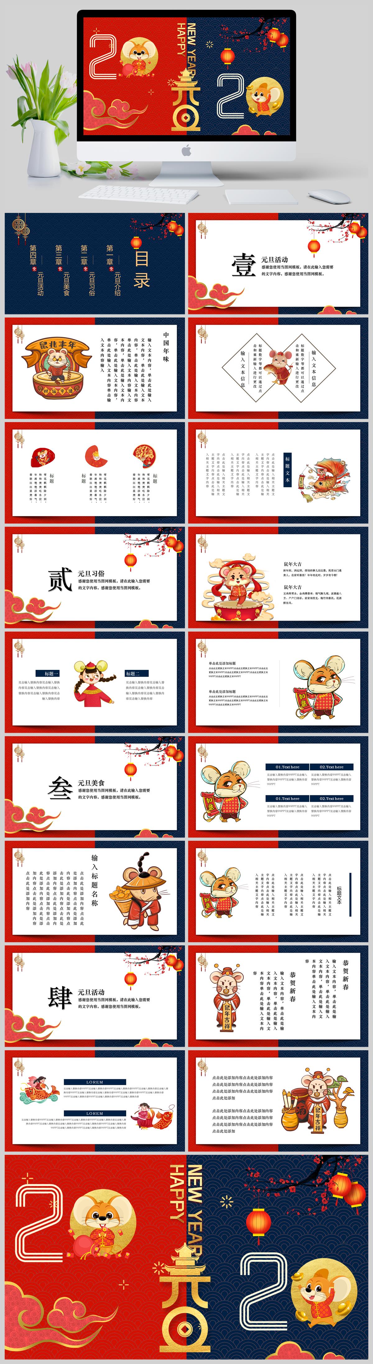 红蓝撞色中国风元旦介绍PPT模板