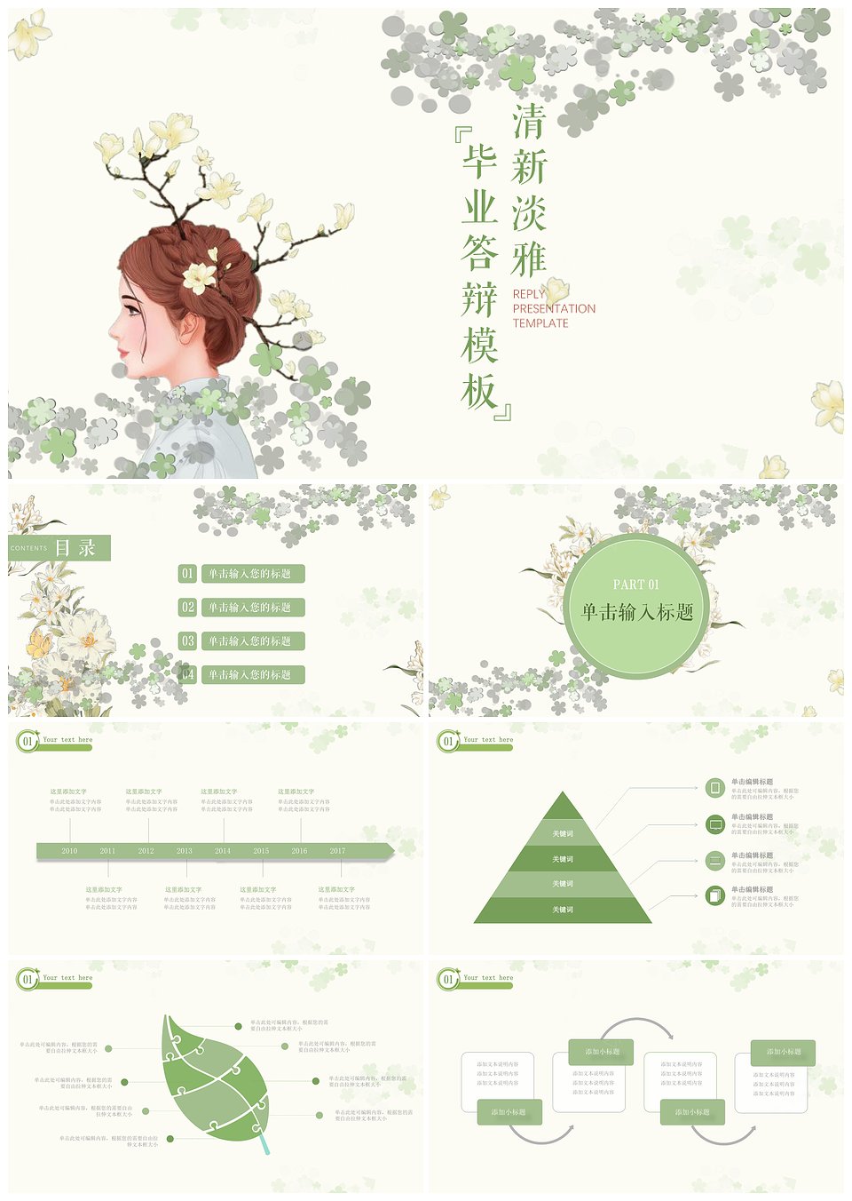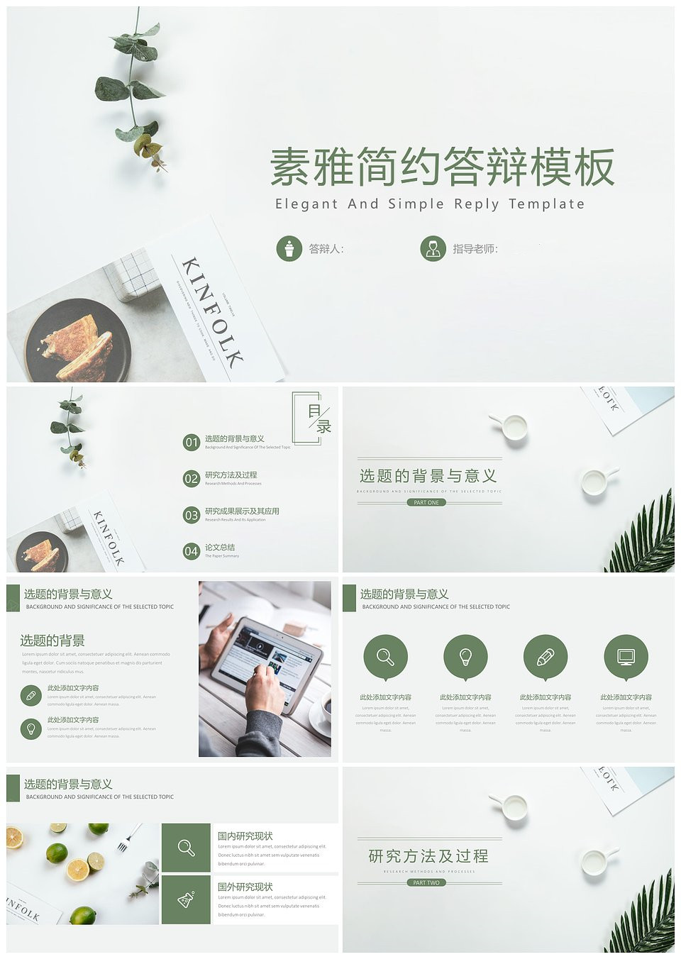 绿色清新淡雅简约毕业答辩PPT模板