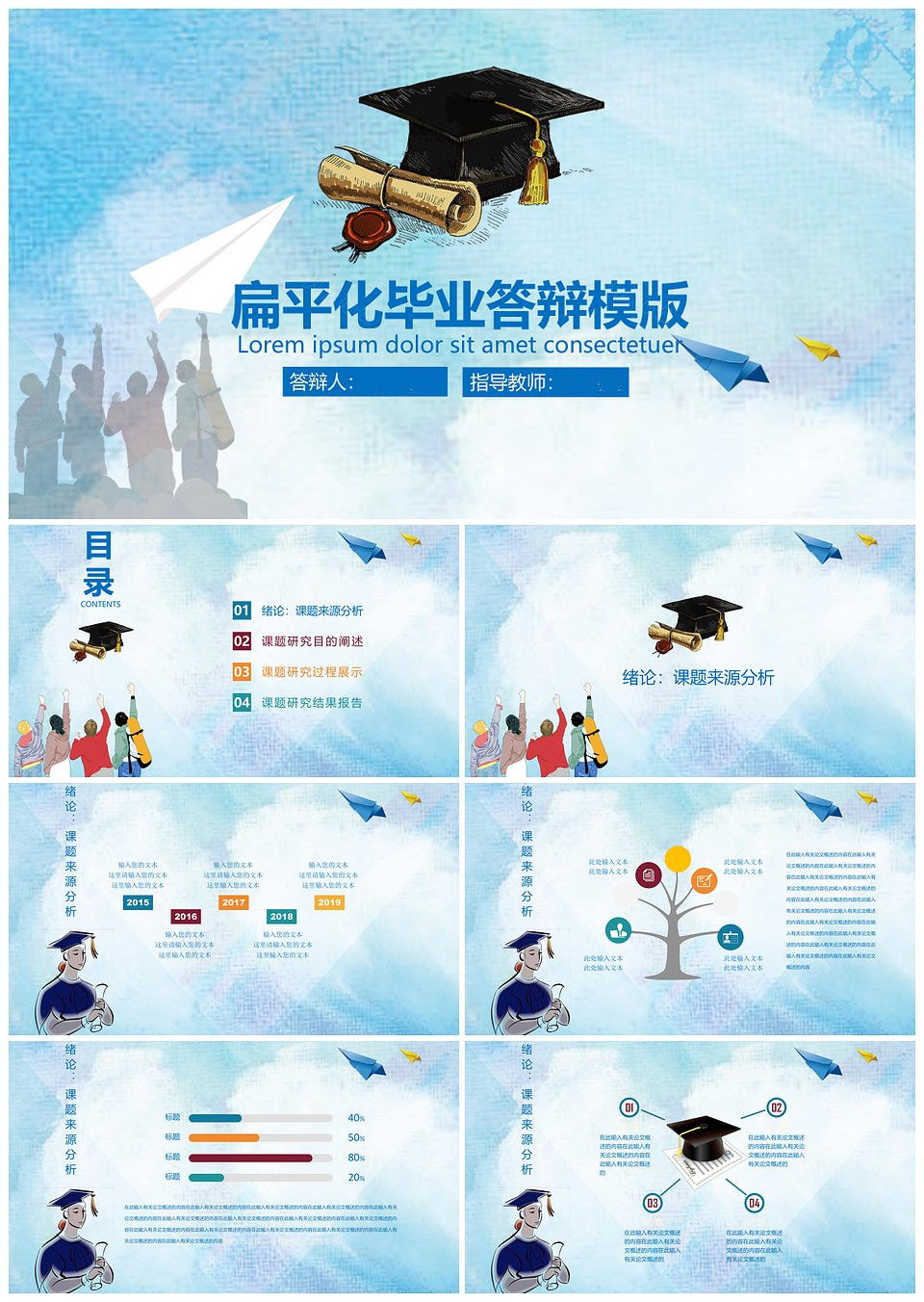 水彩扁平化毕业答辩PPT模版