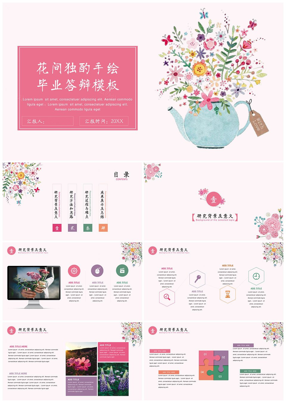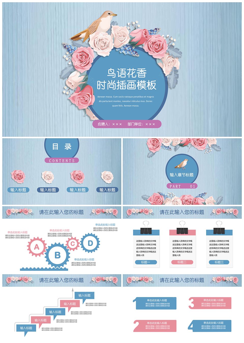 全动态蓝色花卉插画简约风毕业论文答辩PPT模板