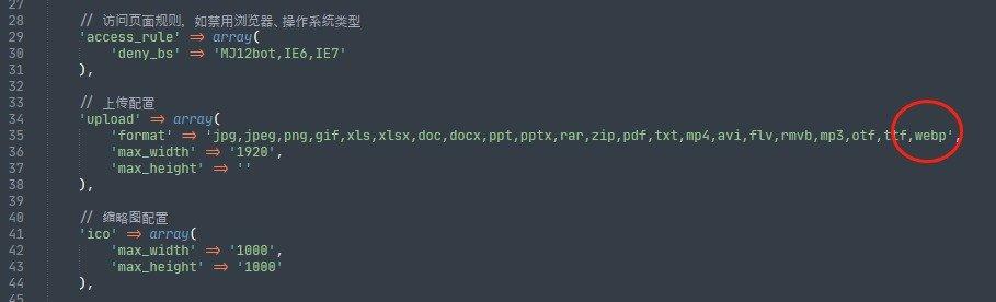 当pbootcms遇到需要修改文件上传格式的时候,先去/config/config.php修改上传配置信息,一般情况下在这里修改就可以了。打开/config/config.php修改upload配置信息,增加webp格式...