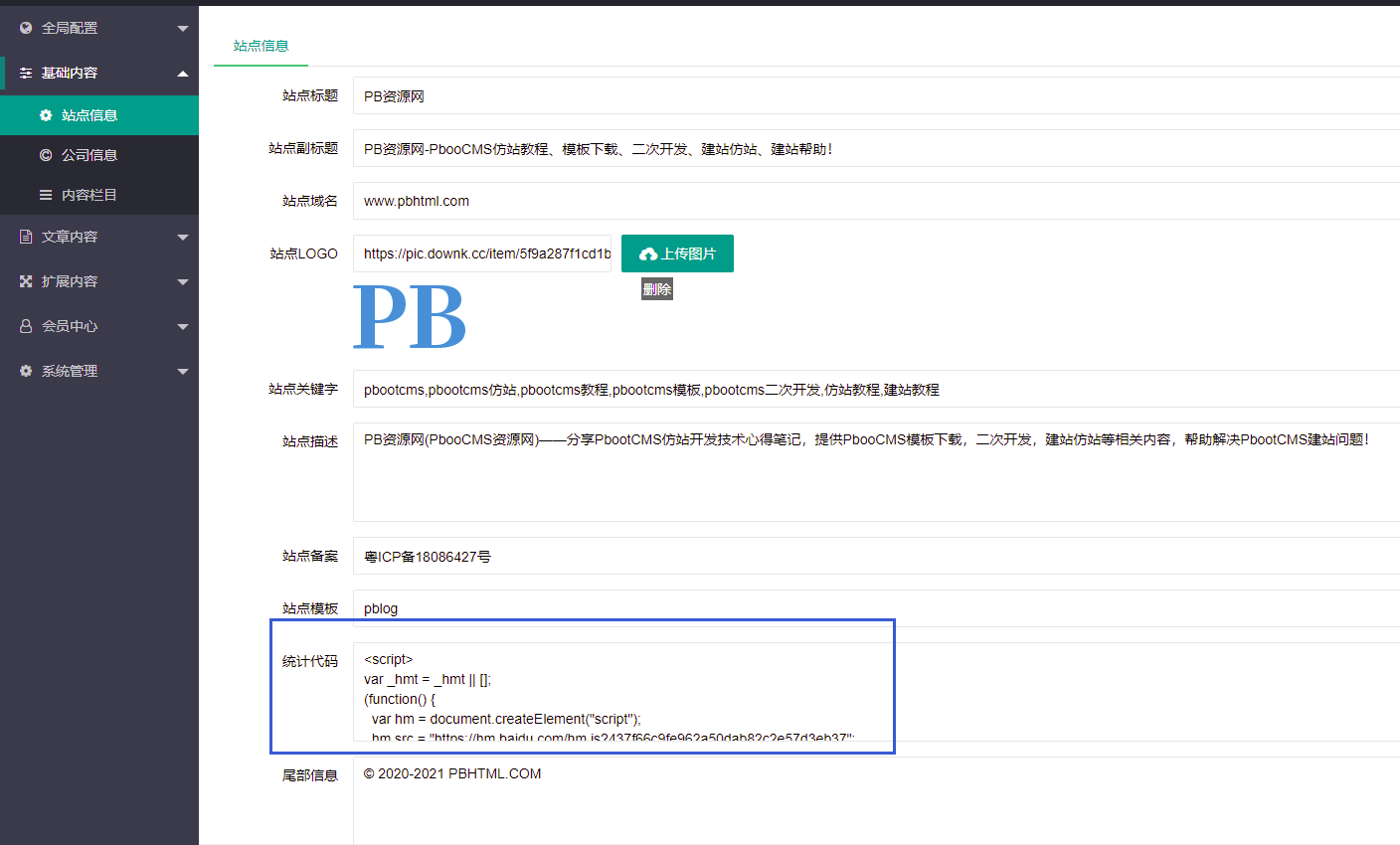 pbootcms安装百度统计代码或者其他第三方统计代码,直接登录后台,打开基础内容-站点信息,找到统计代码,把统计代码粘贴进去即可。...