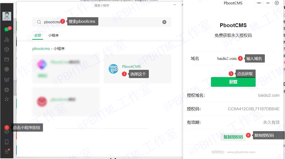 其实除了去官网获取pbootcms的免费授权码,还可以通过微信小程序搜索pbootcms,也是官方制作的。只需按照图标运行,即可将小程序保存到桌面,下次点击桌面启动会更方便。...