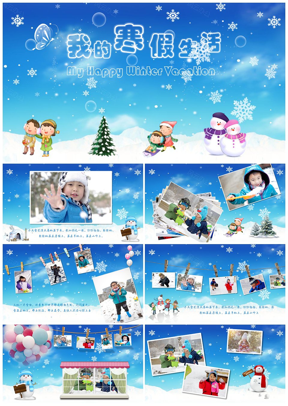 蓝色雪花背景创意动画我的寒假生活儿童成长电子相册PPT