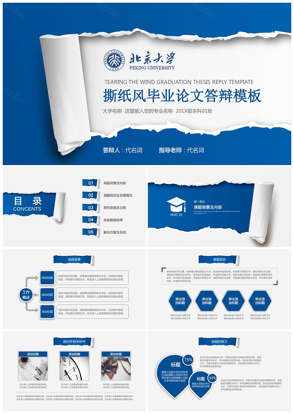 蓝色微立体创意撕纸风格大学生毕业论文答辩ppt模板