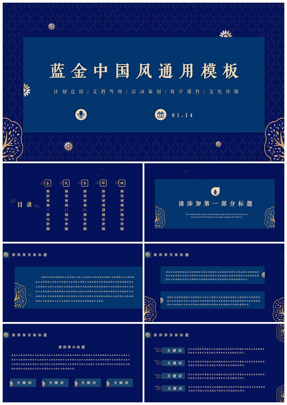 蓝金中国风计划总结策划答辩教学通用PPT模板