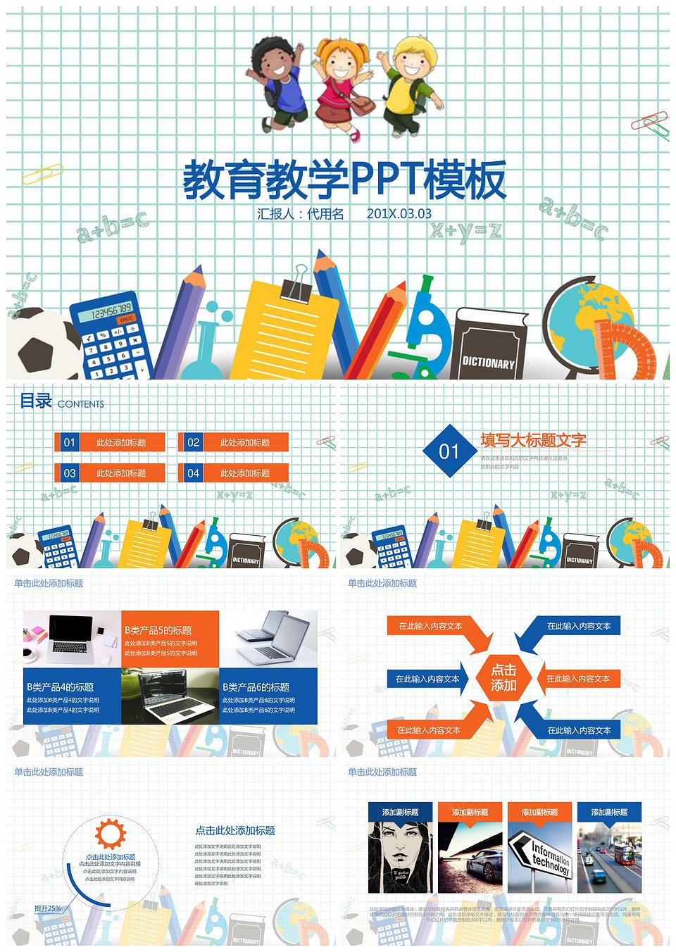 蓝橙扁平化设计可爱儿童教育教学通用动态PPT模板