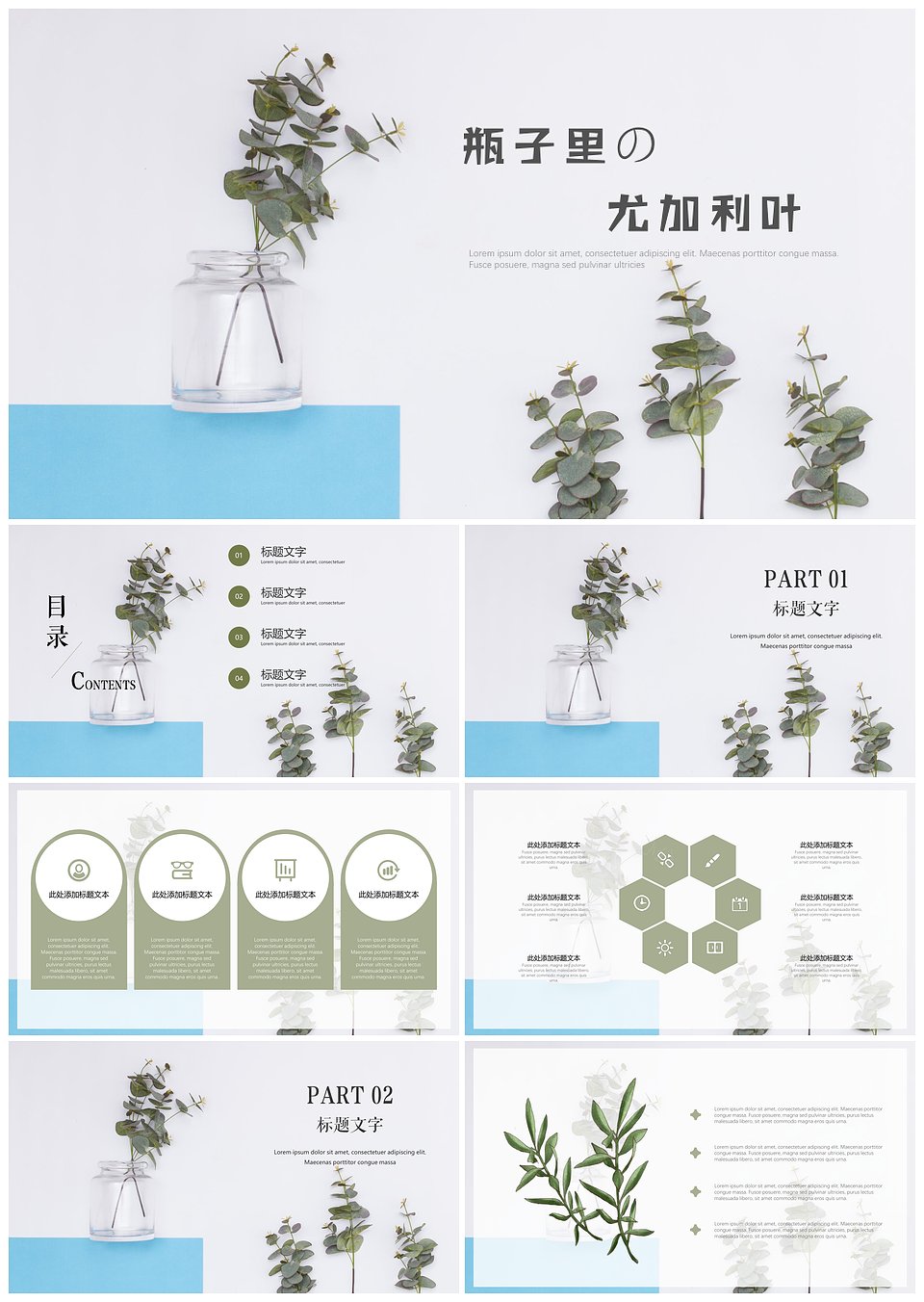 小清新简约尤加利叶通用PPT模板