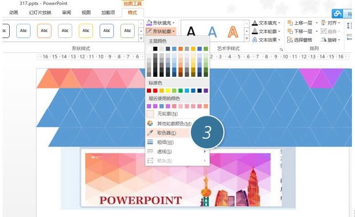 如何使用PPT快速绘制三角形背景效果?方法很简单利用强大的 ppt模板 快捷键和取色器搞定,今天小编给大家带来了详细的教程,有需要的朋友一起来看一下吧。 利用形状中的等腰三角形工具,记住 按住Shift键拖拽绘制一个等边三角形 。如下图 1 处。 接着将等边三...