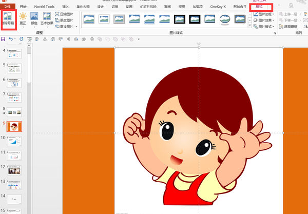 1、选中图片,点击格式选项卡,再点击左上角的删除背景 2、点击删除背景后,图片会如下图那样出现一个边框,紫红色区域即是要删除的区域,可以看到开通人物的手和身体的一部分也在删除范围内 3、鼠标按住边框上的小方框进行拖动,使要保留的部分放在边框之内...