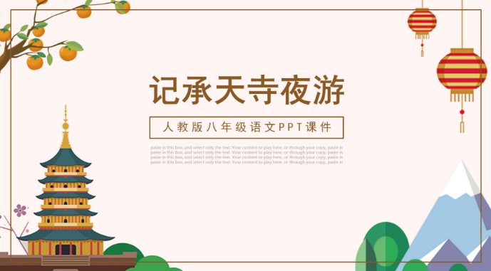 今天为大家介绍一款06人教版八年级语文课件记承天诗夜游ppt模板,有需要的可以来看看。更多下载请点击ppt家园。 这是一款时尚简约的06人教版八年级语文课件记承天诗夜游ppt模板,适用于教育类ppt模板制作。...