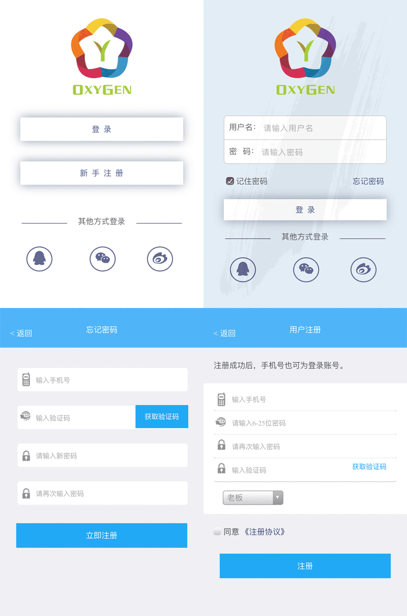 蓝色通用的手机app登录注册页面模板
