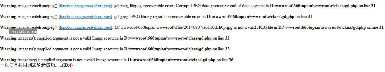 如果站点使用了帝国CMS自动缩略图函数的话,而且恰巧有图片丢失或者顺坏,那么后台更新的时候就容易提示如下图的警告报告! 解决方法,肯定就是找到哪个图片(标题图片)丢了或者坏了...