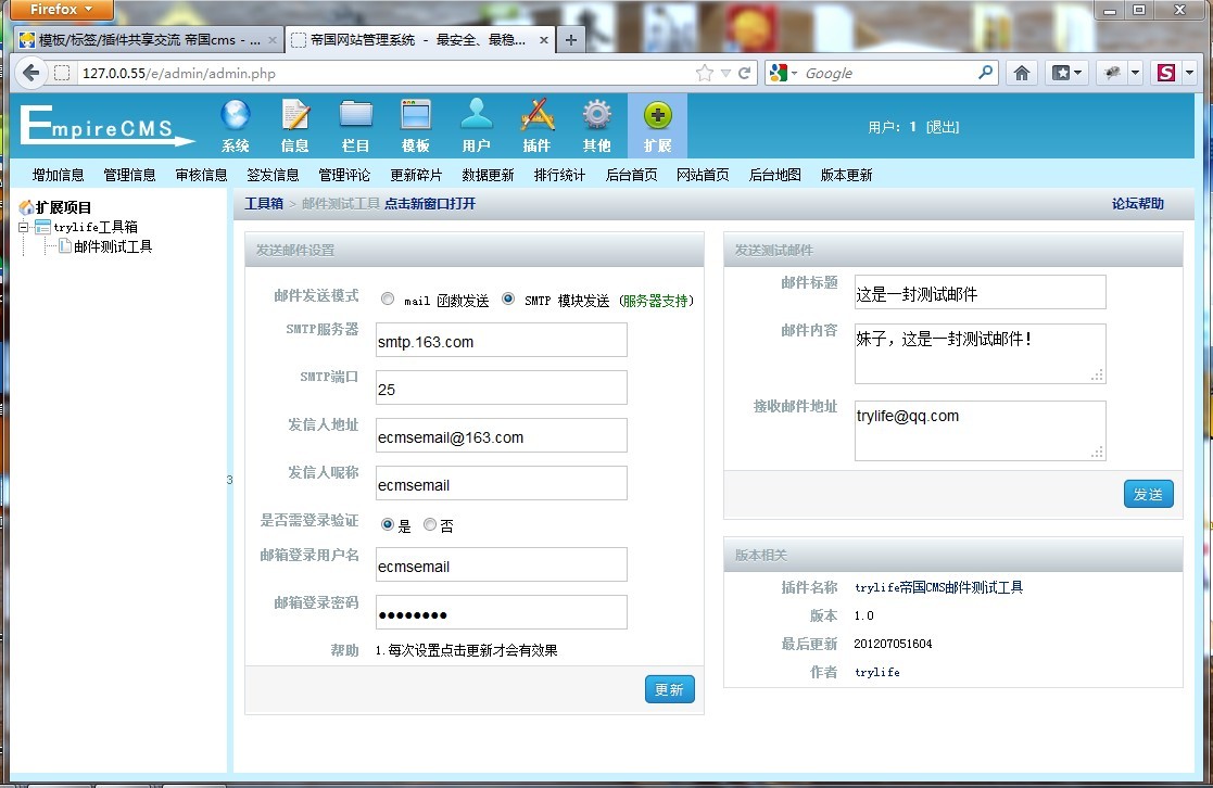 有了这个工具,在配置帝国CMS发送邮件设置时就可以先测试下配置是否正确。感谢帝国CMS论坛版主trylife分享: 订阅更新http://list.qq.com/cgi-bin/qf_invite?id=3be2d8029d590d2b4d1b0a2ca06629afbe090540416a8574用途:...