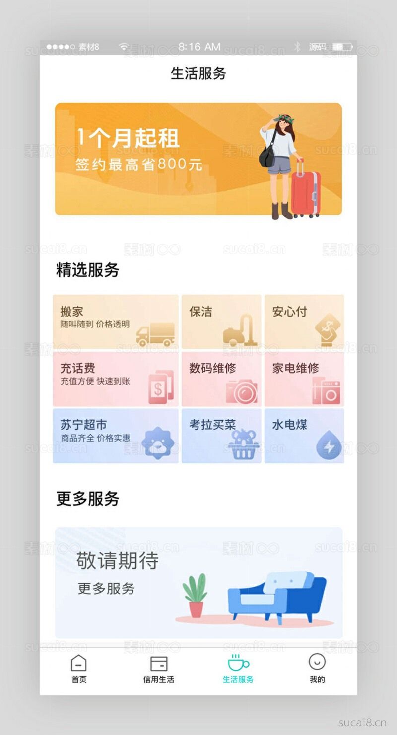 生活服务应用快速导航页面模板精选服务,搬家,清洁,安心支付,电话费,数码,家电,苏宁超市,买菜,水电,更多服务等。...