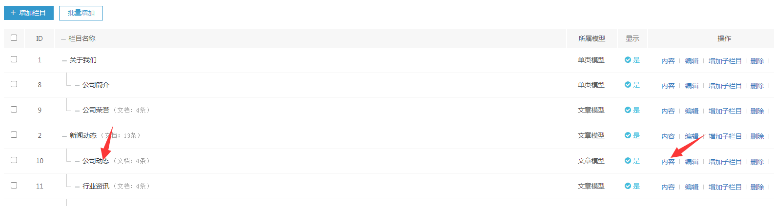 进入后台 栏目管理 点击进对应的栏目进行内容管理,如下图 内容管理操作界面 比如进入一个文章列表栏目,如新闻动态: 新增文章: 点击右上角红色按钮添加内容,可以发布新的内容...