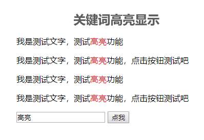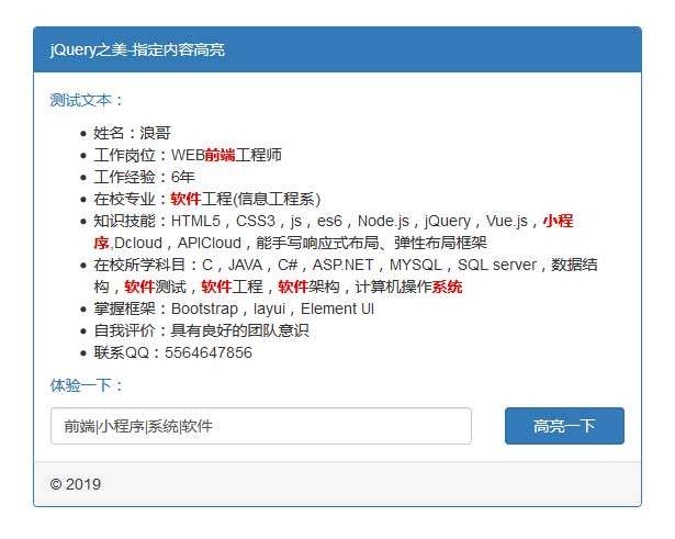 jQuery简单的设置段落文本,通过输入框查找关键词,相应的文字高亮显示效果。支持多个关键词查找,注意格式如:前端|小程序|系统|软件。...