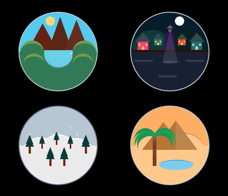这是一款基于纯CSS3 keyframes实现的户外场景卡通动画特效。包括了山水、日落、灯塔、雪景、沙漠棕榈树、霓虹灯夜景等元素。共有5个场景动画。...