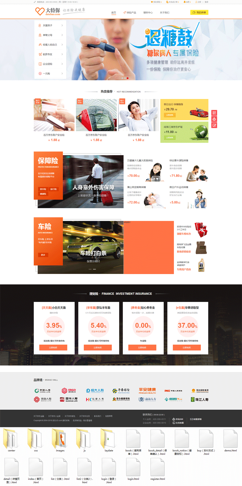 (包含个人中心页面)保险产品、理财中心、关于我们、我的保单、登录、注册、保险详情页面、填写保单、健康告知、支付方式、优惠券、添加常用联系人、常用联系人、我的积分、消息中心、我的保险、账户及密码、橙色的保险商城网站模板html全套源码下载。...