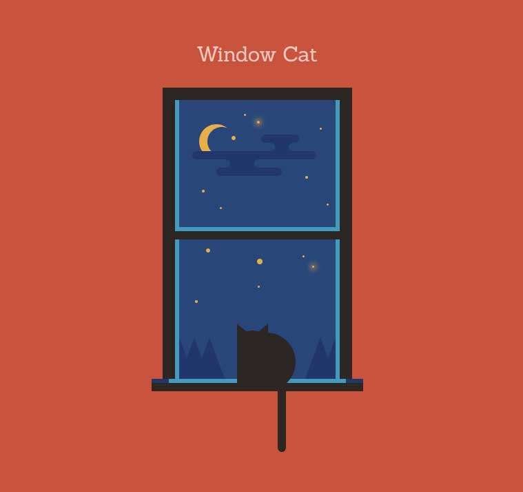 css3绘制夜空下望着窗外的小猫,窗口小猫动画场景特效。...