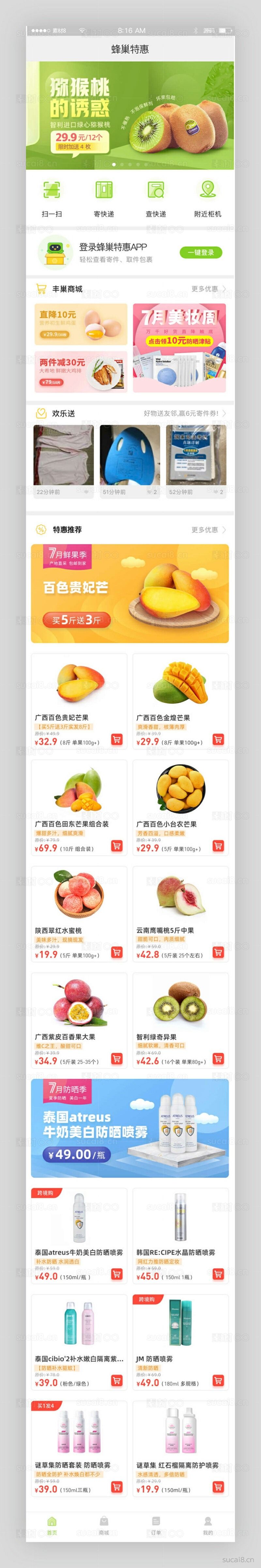 绿色蜂窝专用购物中心手机模板清扫、快递、支票快递、橱柜机、蜂窝商城、欢乐颂、特色推荐等功能...