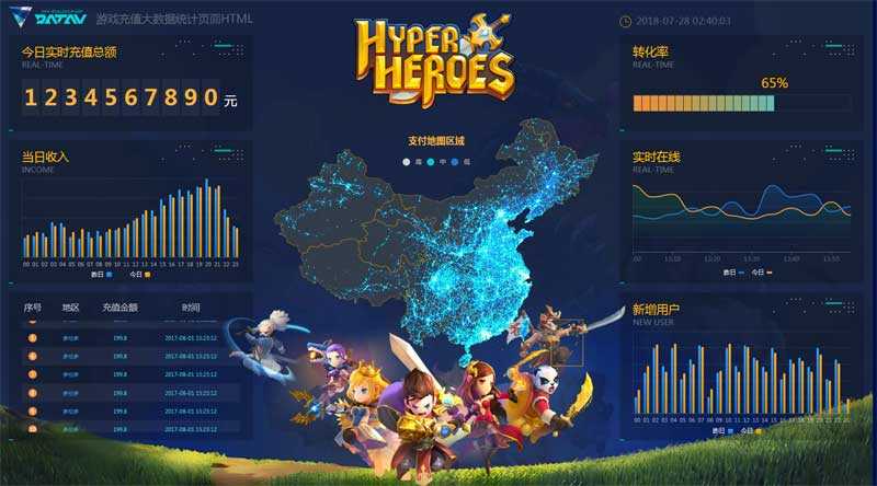 游戏充值平台大数据统计图表页面HTML模板,结合echarts插件图表统计分析今日实时充值总额,转化率,当日收入,新增用户。...