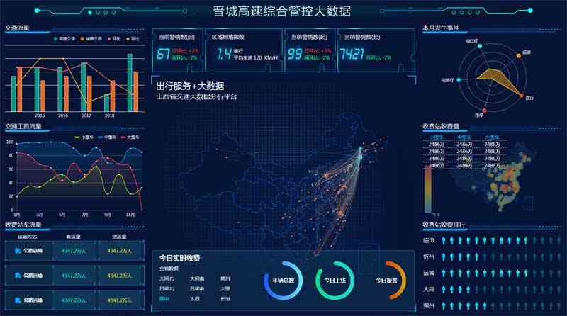 蓝色科技感的高速交通综合管理可视化图表统计页面ui模板。主要有:交通流量,交通工具流量,收费站车流量,本月发生事件,收费站收费量,收费站收费排行,今日实时收费等数据图表管理。...