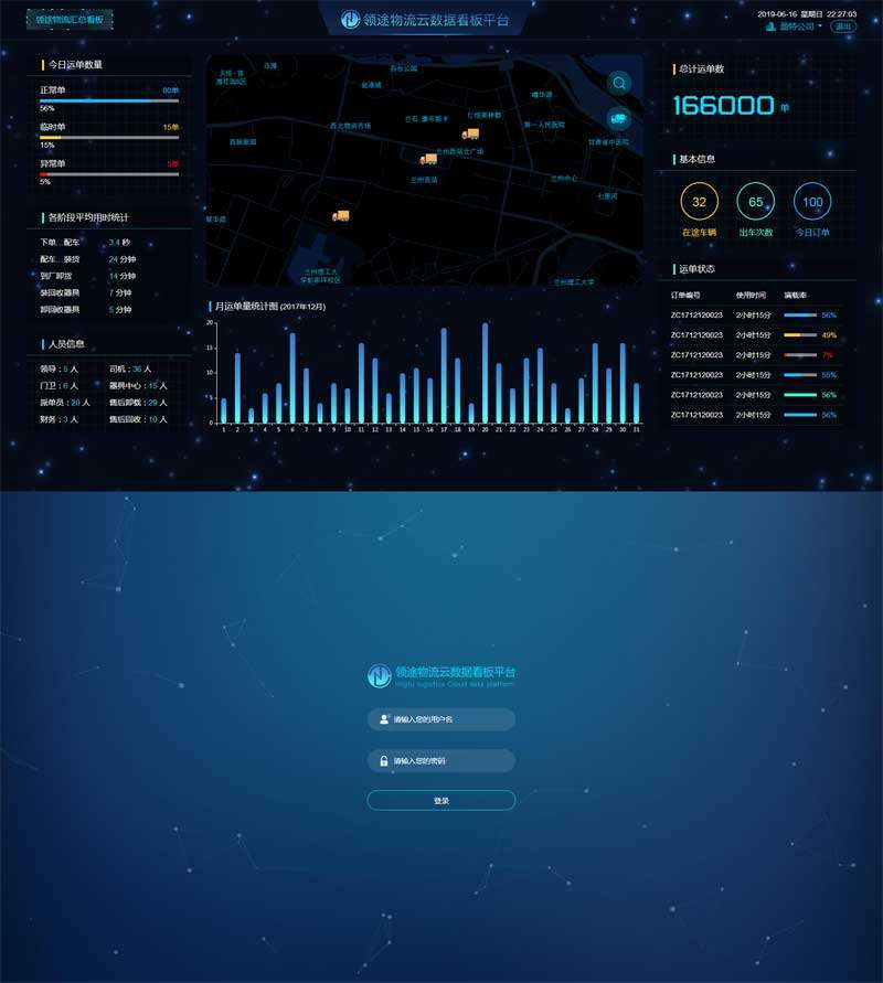 使用echarts.js实现酷炫的物流云大数据看板页面html5模板。今日运单数量,各阶段平均用时统计,人员信息,月运单量统计图,总计运单数,基本信息,运单状态等统计图表页面模块。含:登录和主页两个页面。...