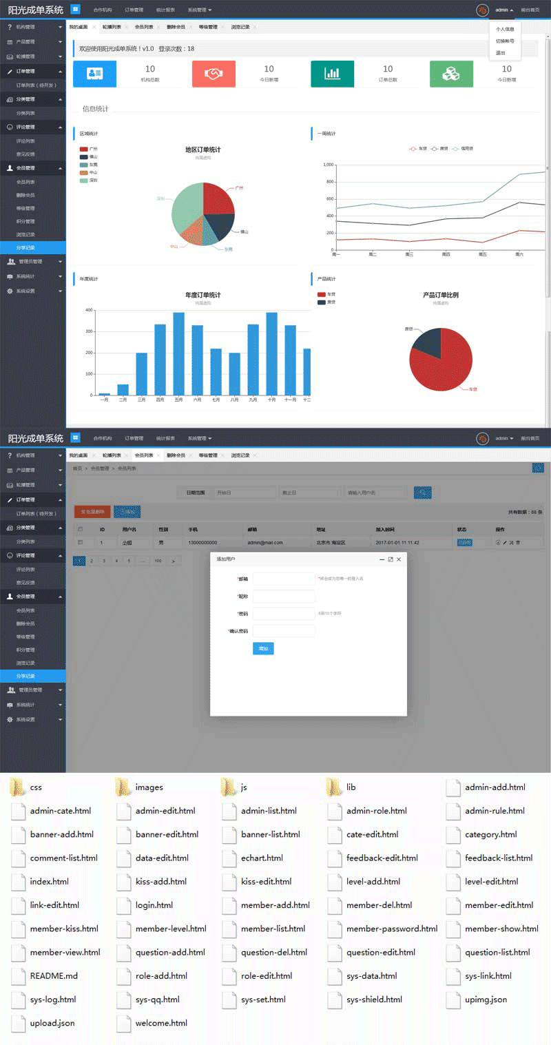 layui框架后台管理模板,实用的阳光成单系统后台模板整站源码。后台包含:机构管理、产品管理、轮播管理、订单管理、分类管理、评论管理、会员管理、管理员管理、系统统计、系统设置等模块管理页面。...
