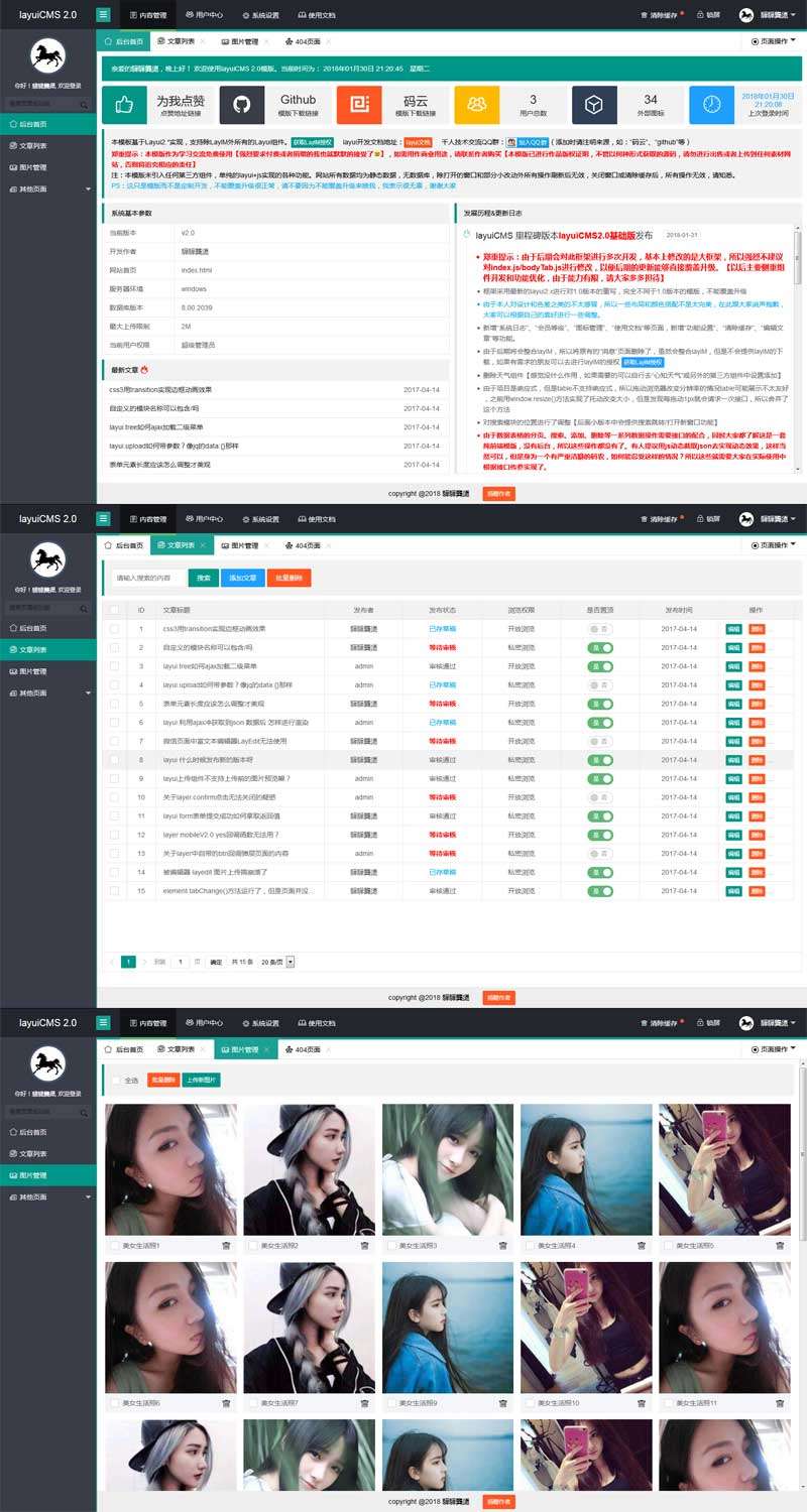 layuiCMS2.0企业网站后台管理模版是在layuiCMS基础上进行的升级优化,同样是纯前端页面,可与任何框架【vue、ag等】和后台语言【java、.net、php等】兼容,2018年01月31日正式开源在Github和码云上,在此为提前发布。 ps:本地要在localhost才能正常访问。...
