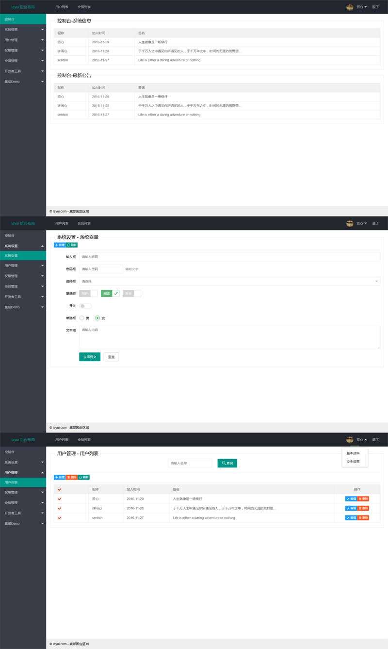 layui企业网站后台界面模块,主要分顶部快捷菜单和用户登录信息,左侧分类下拉导航菜单,中间主要内容模块和底部固定页脚。这是一款简洁通用的网站后台模板总共6个页面。...