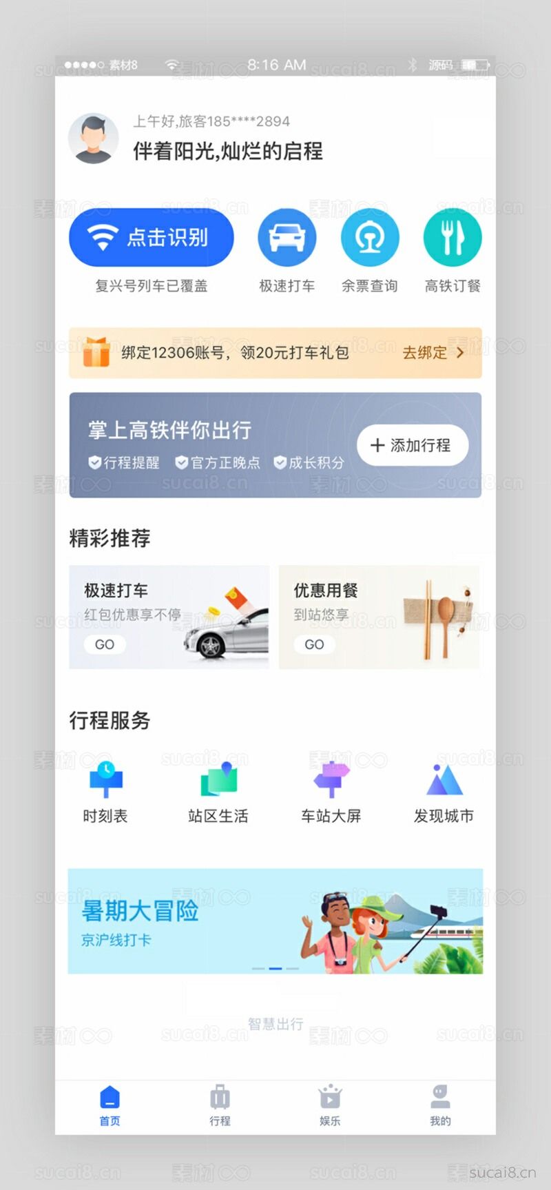 移动应用旅行服务软件功能页面模板快速打车,查询剩余车票,高速铁路餐饮,精彩推荐,旅游服务,汽车时刻表,车站生活,车展屏幕,城市探索等。...
