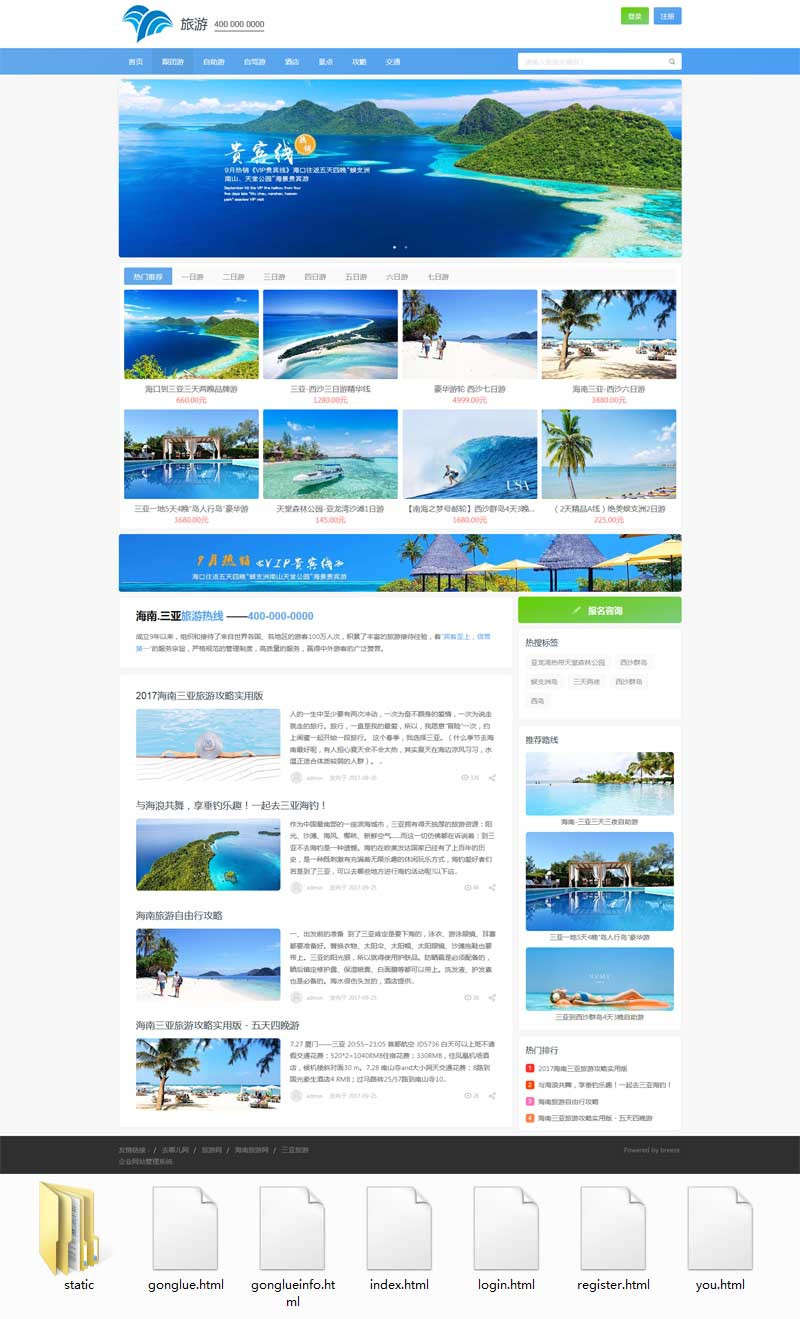 蓝色实用的旅游公司网站,响应式的旅行社网站,旅游攻略资讯类型网站模板html下载。主要页面有:登录、注册、旅游资讯列表页、详情页等总共6个页面。...