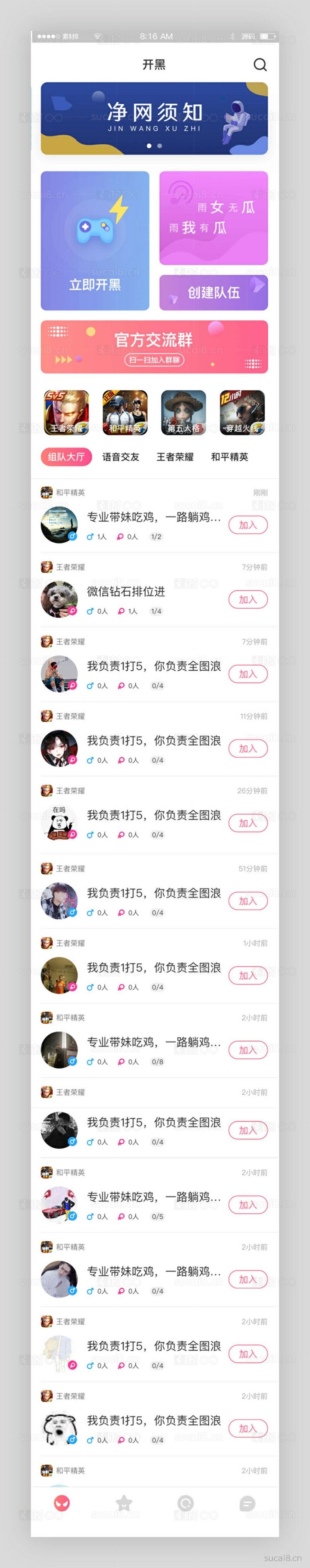 移动应用游戏实时封锁教程列表页面模板团队建设大厅、语音约会、国王的荣耀、和平管理等...