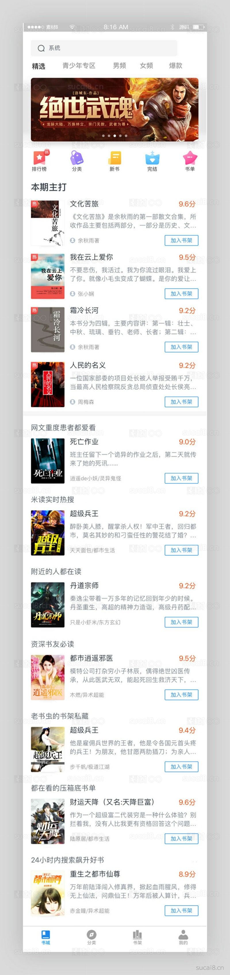 网上书店应用阅读小说列表页面模板排名、分类、新书、结局、书目、这一时期的主要小说等...