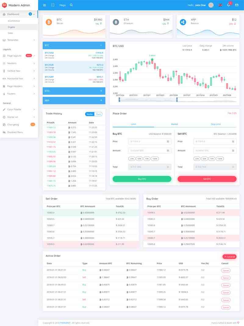 Modern是可以创建电子商务Web应用程序的模板工具包,销售比特币虚拟货币管理后台模板。模板文件夹结构,清洁注释代码,1500+页,1000+组件,100+图表,50+小部件和更多,提供了RTL版本。结合HTML5,SASS,GRUNT, PugBootstrap4稳定版本。Modern管理是清洁的Bootstrap...