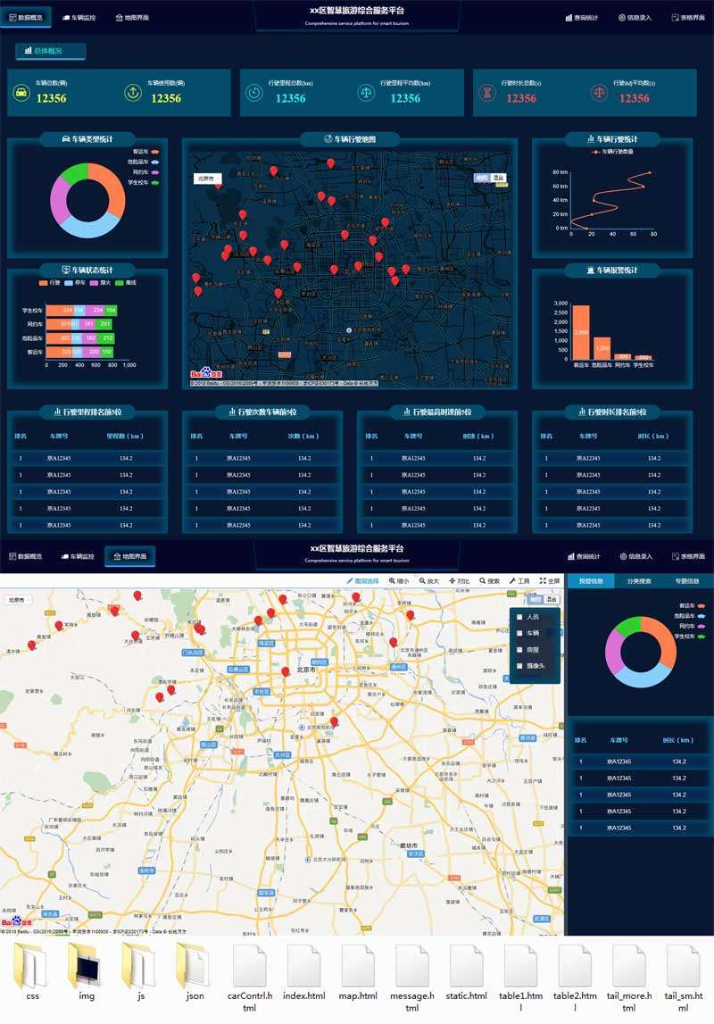 智慧旅游综合服务平台后台大数据管理系统模板,车辆监控服务后台系统模板html下载。该系统主要包括地图监控,统计分析,表格管理,视频监控,文本录入等界面。主要用于系统的后台展示。大气好看,总共10个页面。...
