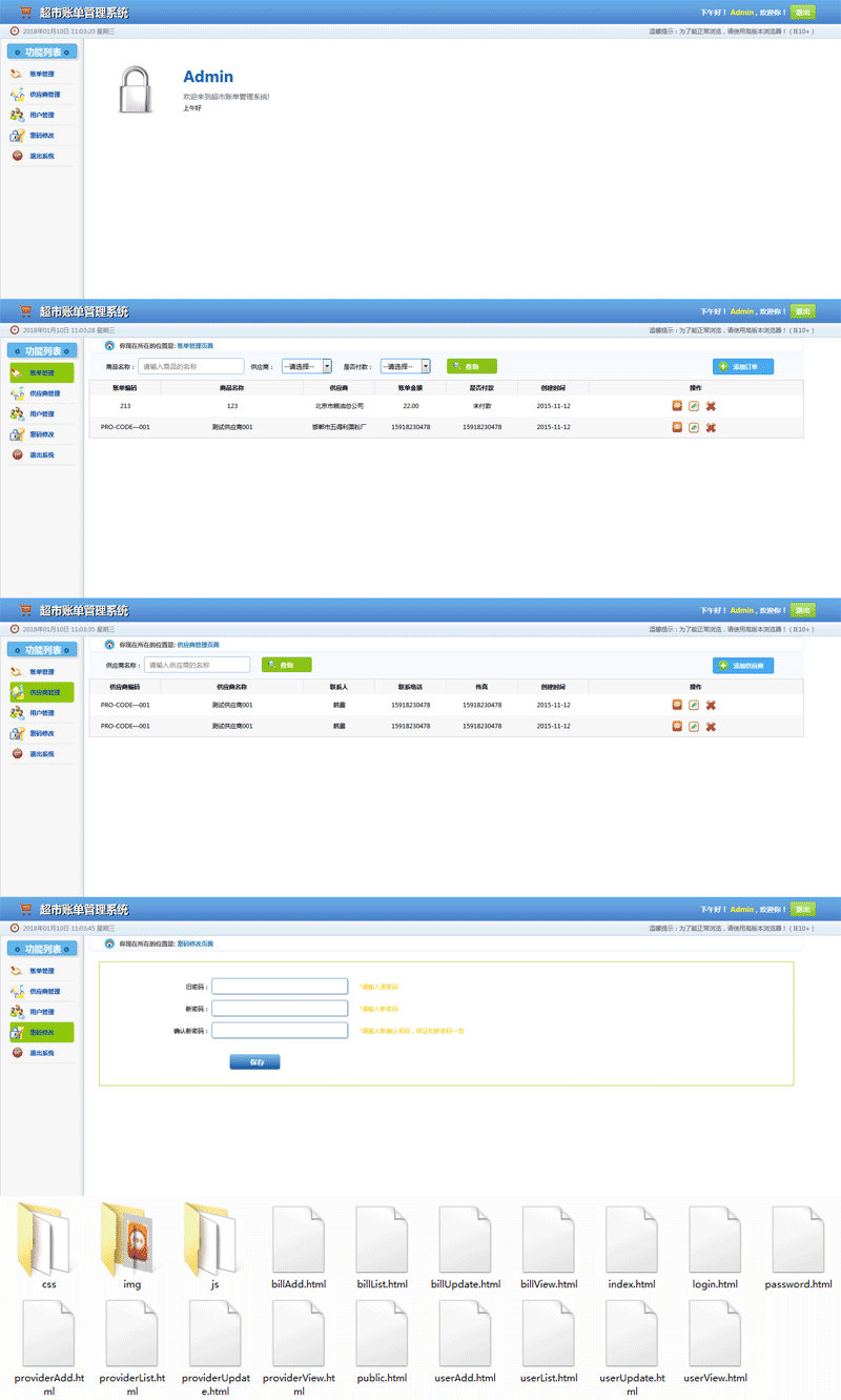 超市管理系统cms界面模板,蓝色的超市账单管理系统模板。全手写代码。适合开发者运用,界面美观大方。主要页面有:账单管理、供应商管理、用户管理、密码修改、退出系统等总共16个页面。...