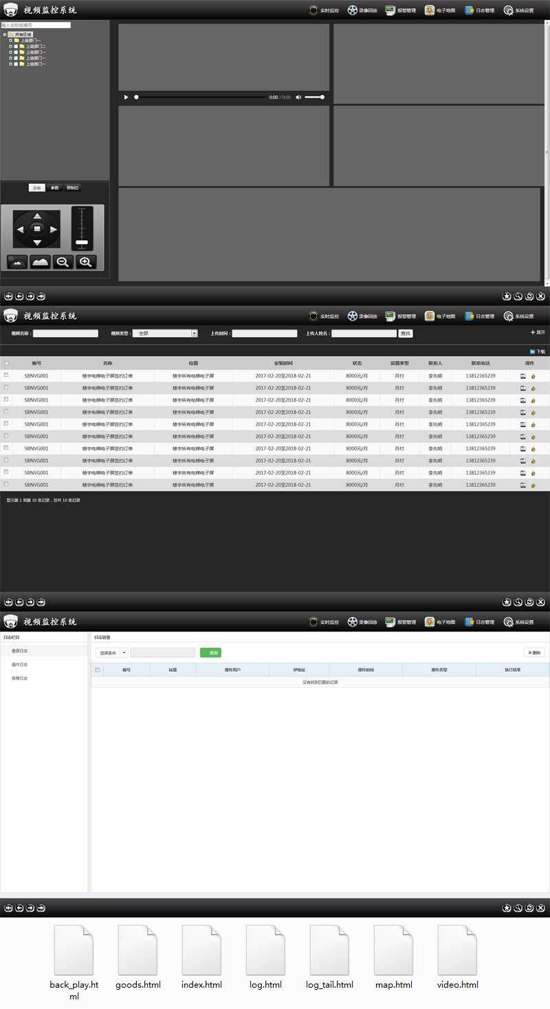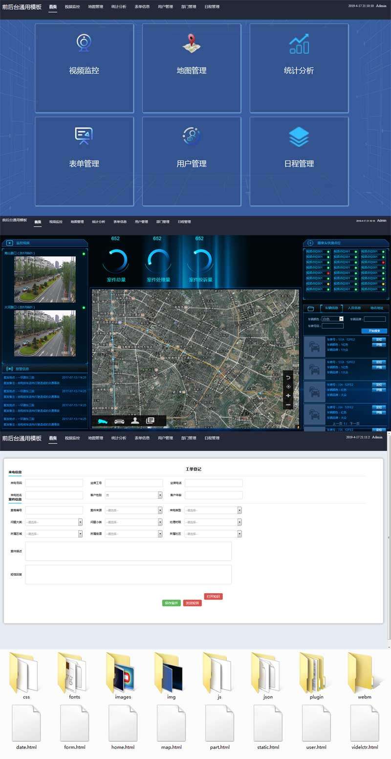 通用的道路视频监控报警系统OA后台页面模板html下载。包括了视频监控,地图监控,表单管理,统计分析,用户管理,部门管理等页面。...