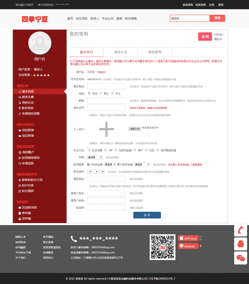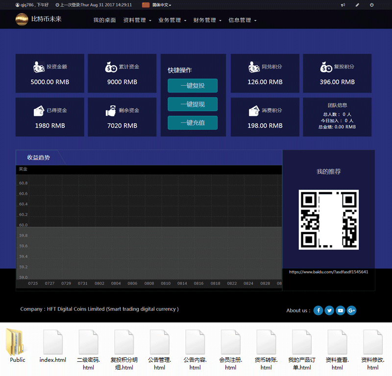 交易投资个人中心管理页面模板,比特币、虚拟币、投资管理网页模板。主要页面有:二级密码、复投积分明细、公告管理、公告内容、会员注册、货币转账、我的产品订单、资料查看、资料修改等总共10个页面。...